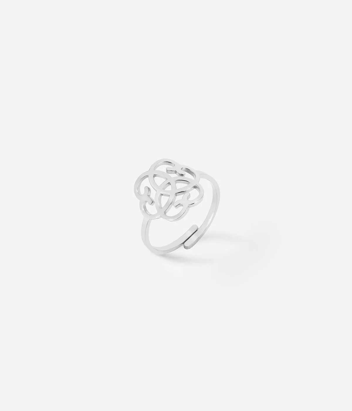 Bague ajustable en acier uni ou doré présentant un motif d'arabesque en son centre.